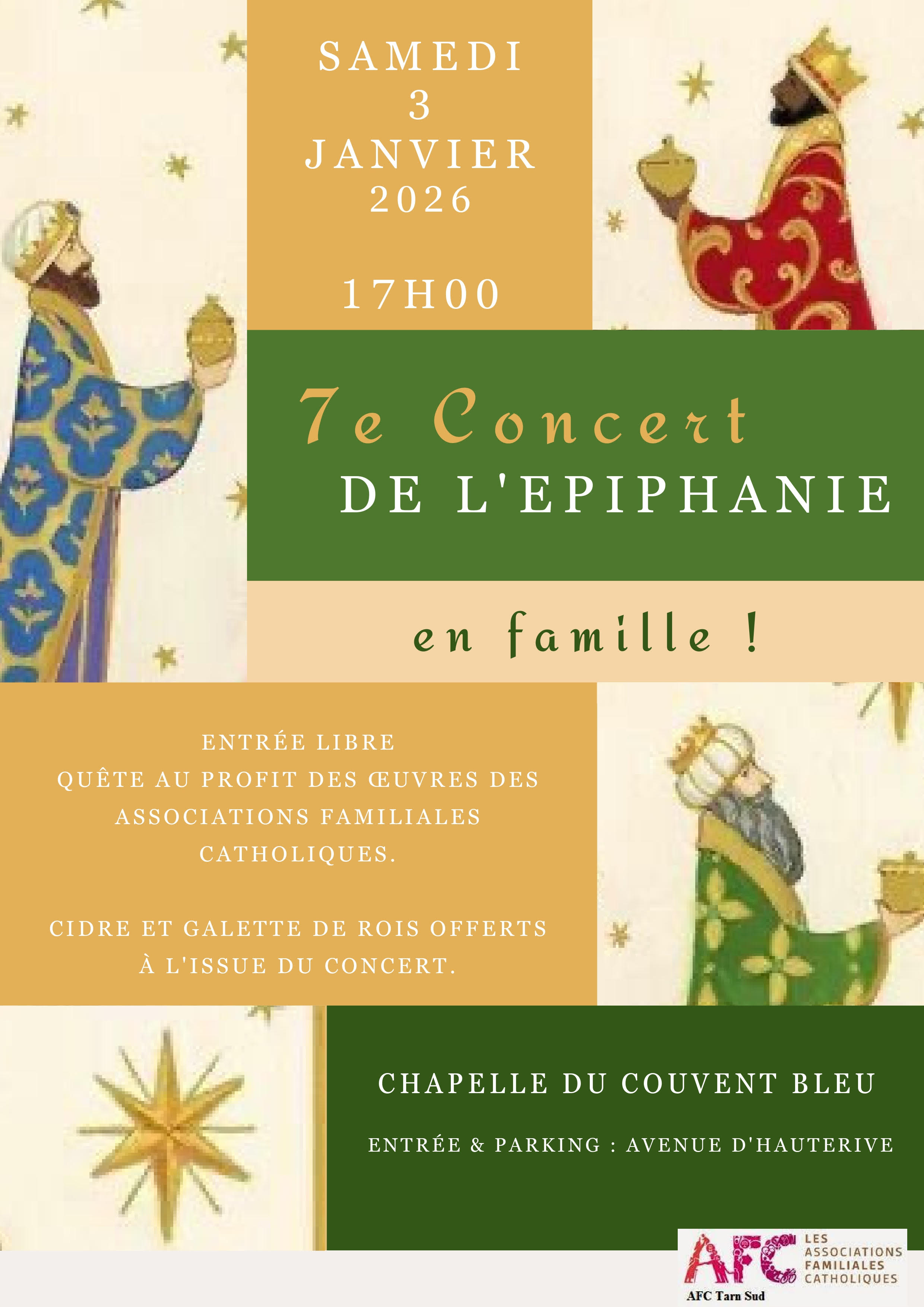 Samedi 3 Janvier à 17H à la Chapelle du couvent Bleu "7ème édition du CONCERT de l'EPIPHANIE en FAMILLE"(entrée du parking par le 17 avenue d'Hauterive), un collectif de 7 à 77 ans de chanteurs, flûtistes musiciens et organistes fêteront avec vous la fête de l'EPIPHANIE.