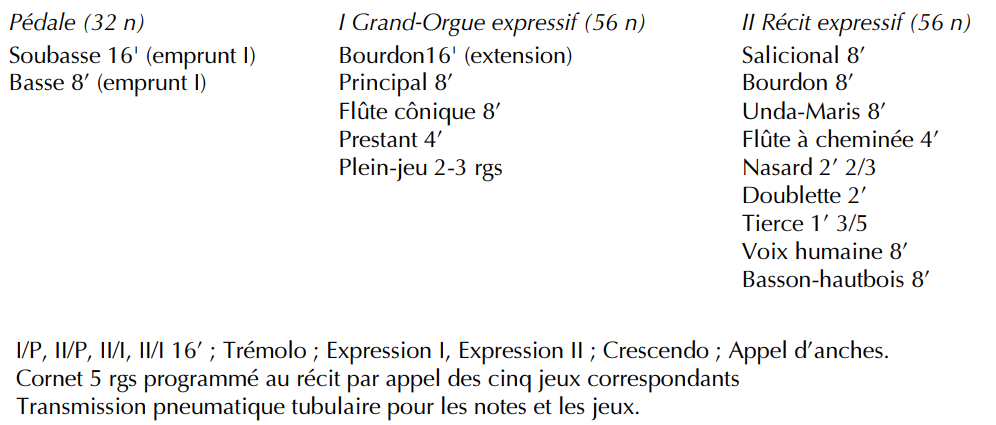 En 1936, Puget réalise pour cette chapelle un instrument très délicat parfaitement adapté à l’acoustique de l’édifice. Très doux mais emplissant parfaitement l’espace sonore, cet orgue est excellent pour la musique symphonique liturgique et pour l’accompagnement vocal ou soliste.