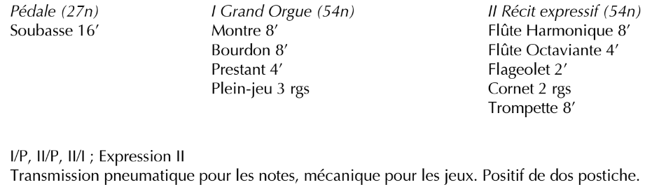 Instrument de Puget début XXème siècle. Il a un plenum bien équilibré et très bien adapté au volume intérieur de l'Église, aussi bien dans les détails (Flûtes) que les Fonds. Paul Manuel a fait un relevage dans les années 90, ce qui offre un instrument liturgique de qualité, qui remplit très bien sa mission.